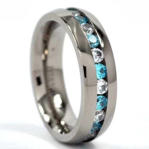 6mm Eternity Titanium Ring Wedding Band with Blue Topaz and CZ's Feature
